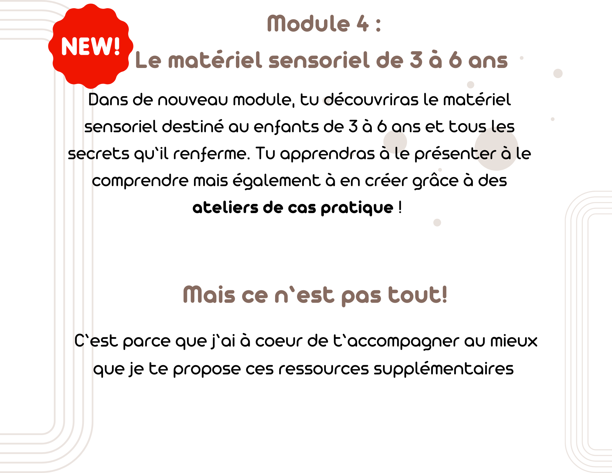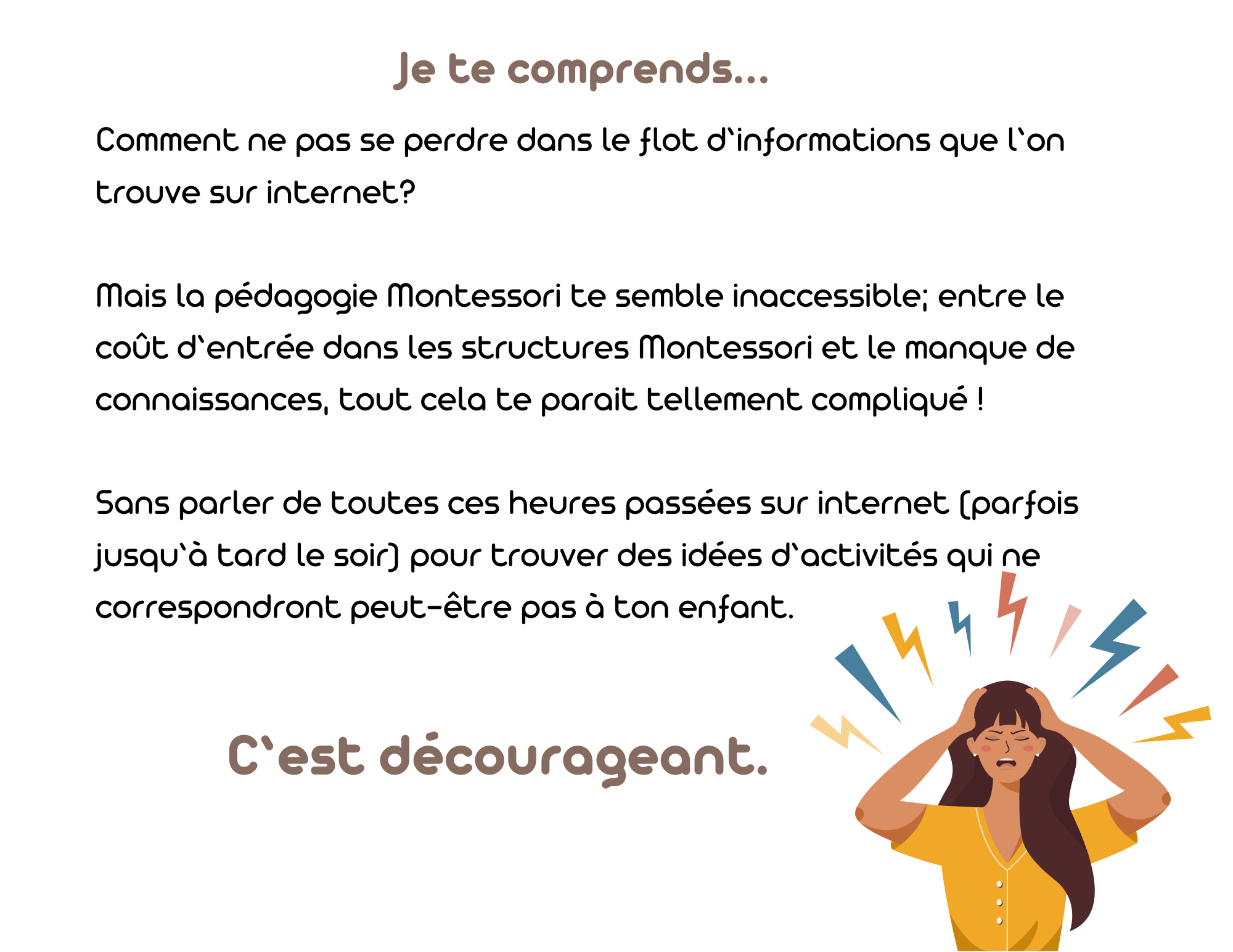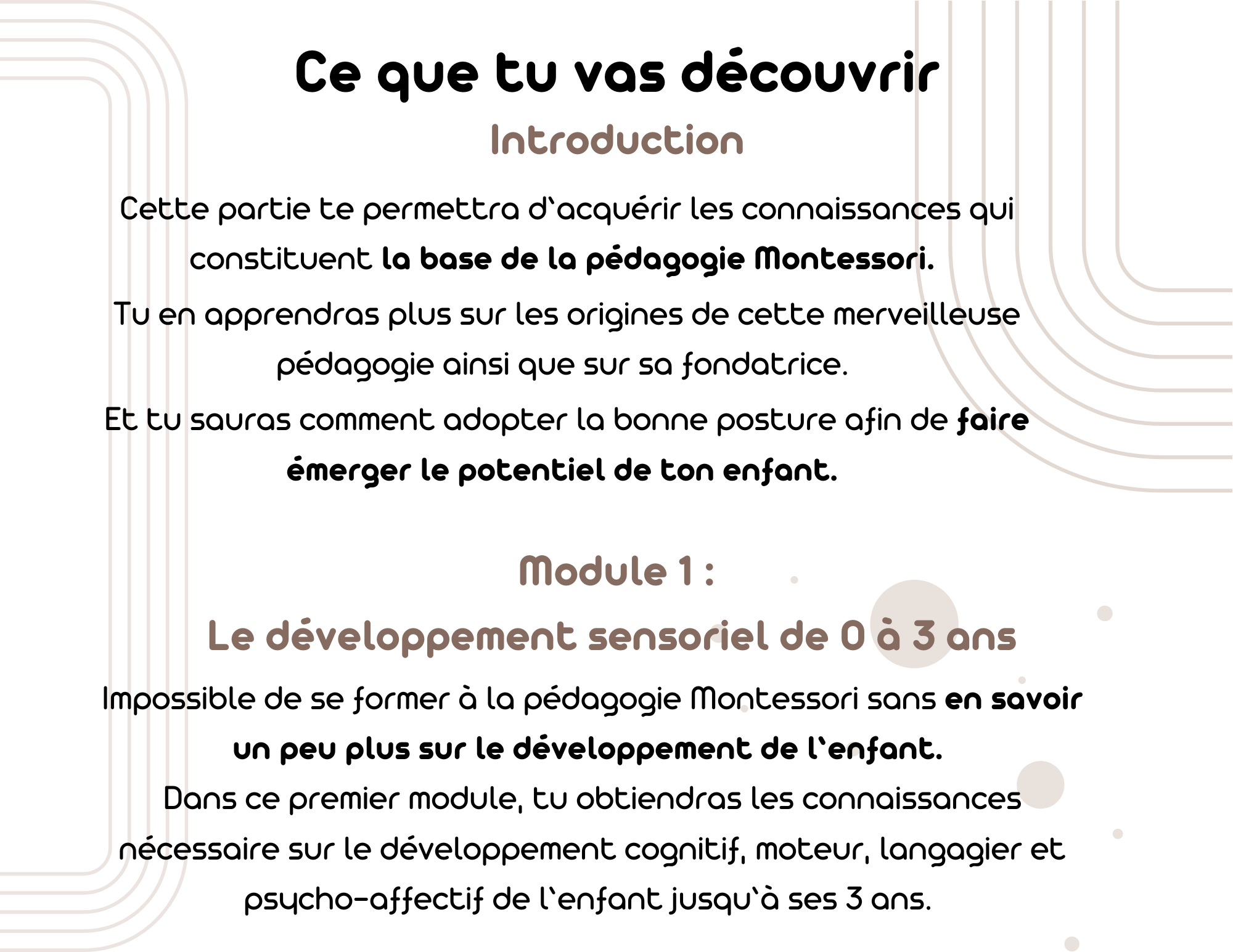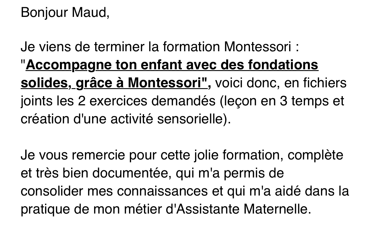 Ma formation est simple mais complète, tu découvriras toutes les bases de la Pédagogie Montessori de manière ludique et très accessible. A l'issue de la formation, un examen de fin de formation te permettra de valider tous tes acquis !