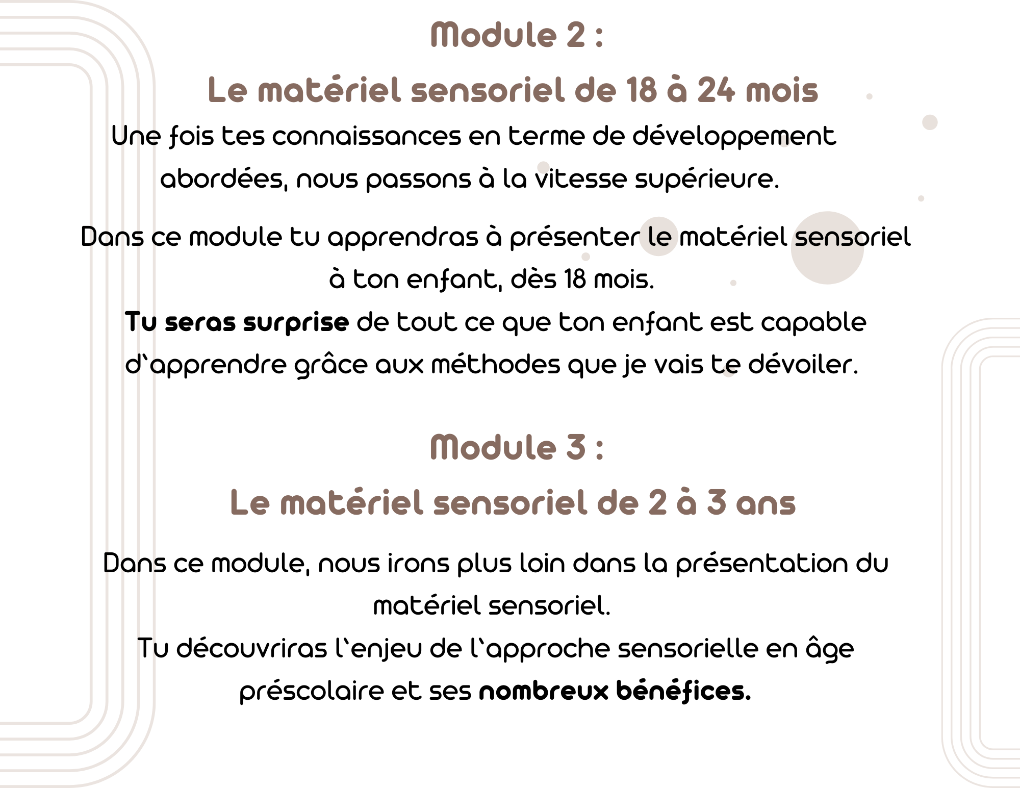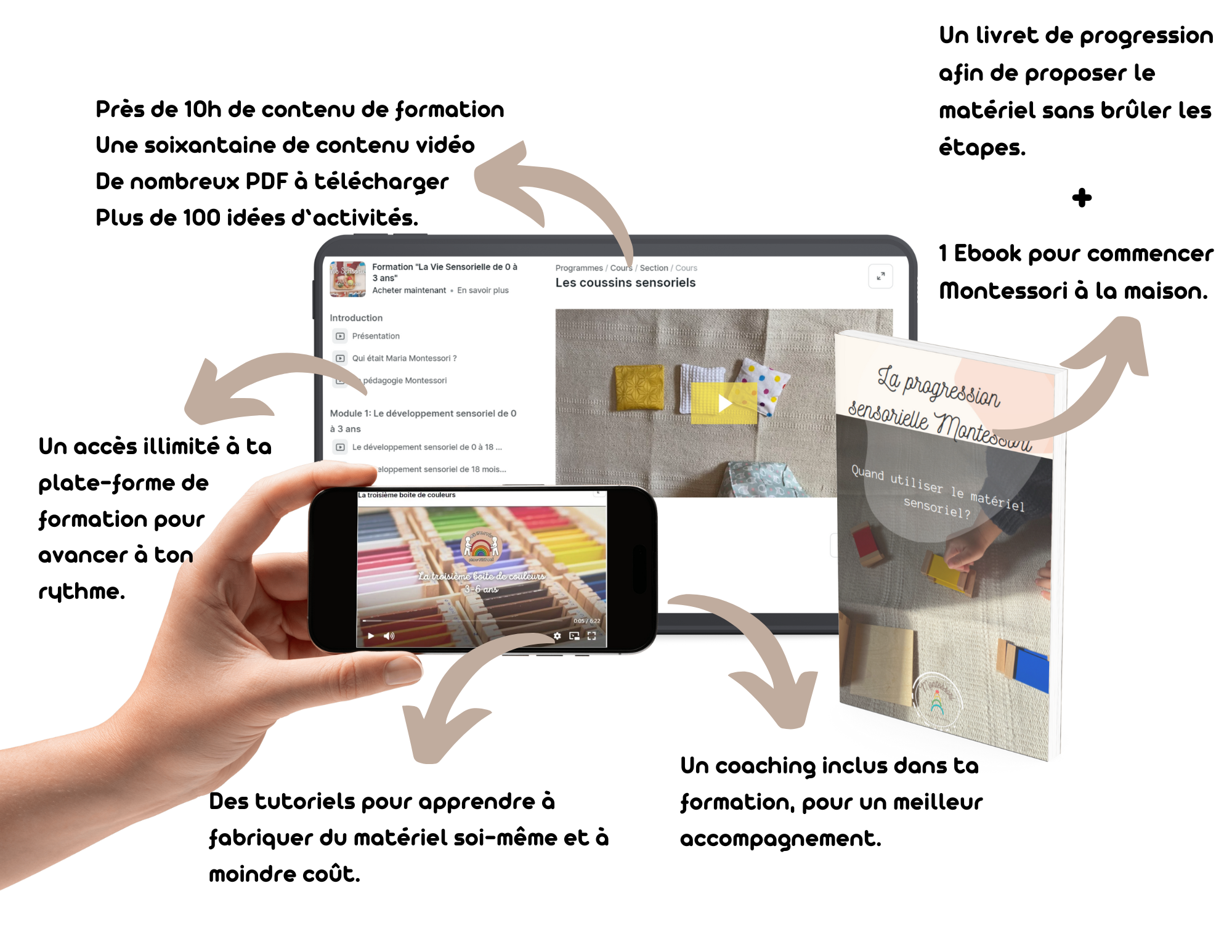 Avec cette formation, ton enfant va acquérir un large éventail de compétences qui lui seront essentielles dans son développement. Il affinera ses sens, favorisera son autonomie et sa concentration, développera sa discrimination et sa coordination motrice, enrichira son langage et son expression verbale, stimulera sa pensée logique et sa résolution de problèmes.